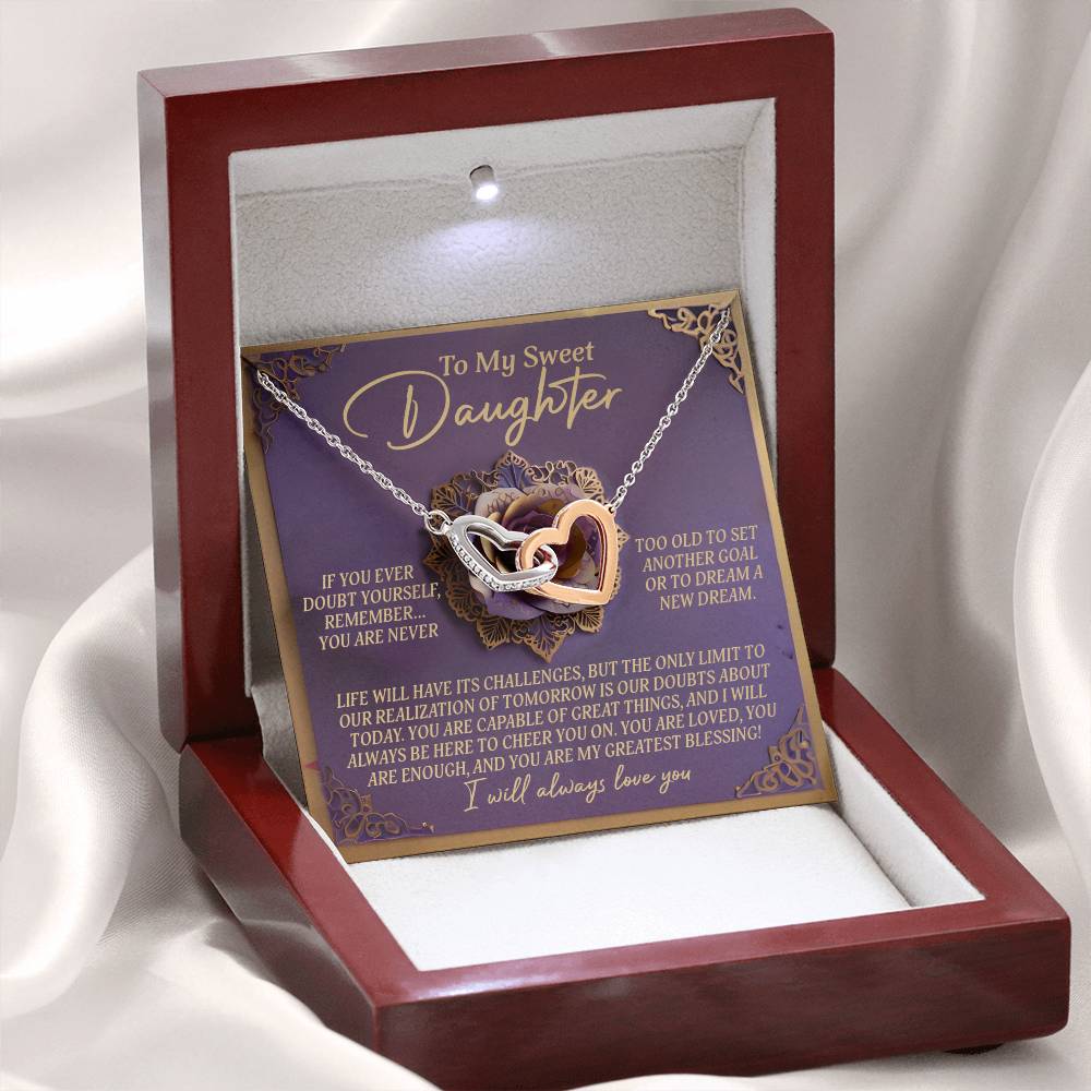 Featuring two lovely hearts embellished with cubic zirconia crystals, this Interlocking Hearts necklace is the perfect accessory for everyday wear. It's a memorable and very special birthday, graduation, wedding, Christmas, or any holiday occasion gift for your lovely daughter.,