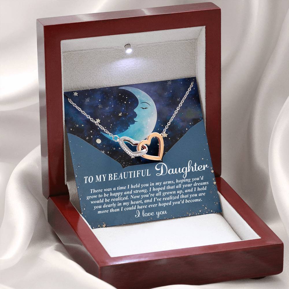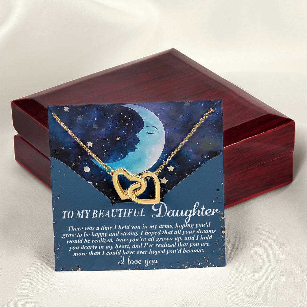 Featuring two lovely hearts embellished with cubic zirconia crystals, this Interlocking Hearts necklace is the perfect accessory for everyday wear. It's a memorable and very special birthday, graduation, wedding, Christmas, or any holiday occasion gift for your lovely daughter.,