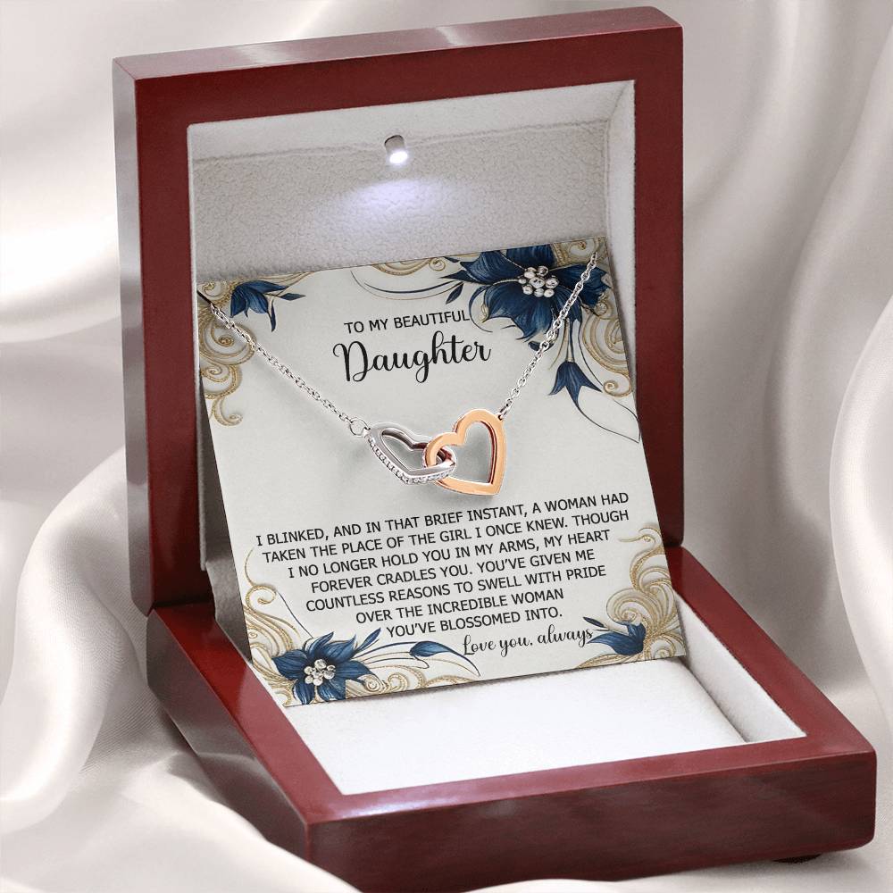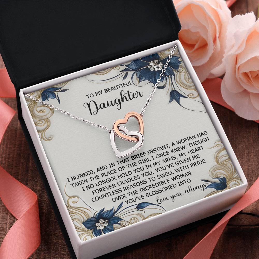 Featuring two lovely hearts embellished with cubic zirconia crystals, this Interlocking Hearts necklace is the perfect accessory for everyday wear. It's a memorable and very special birthday, graduation, wedding, Christmas, or any holiday occasion gift for your lovely daughter.,