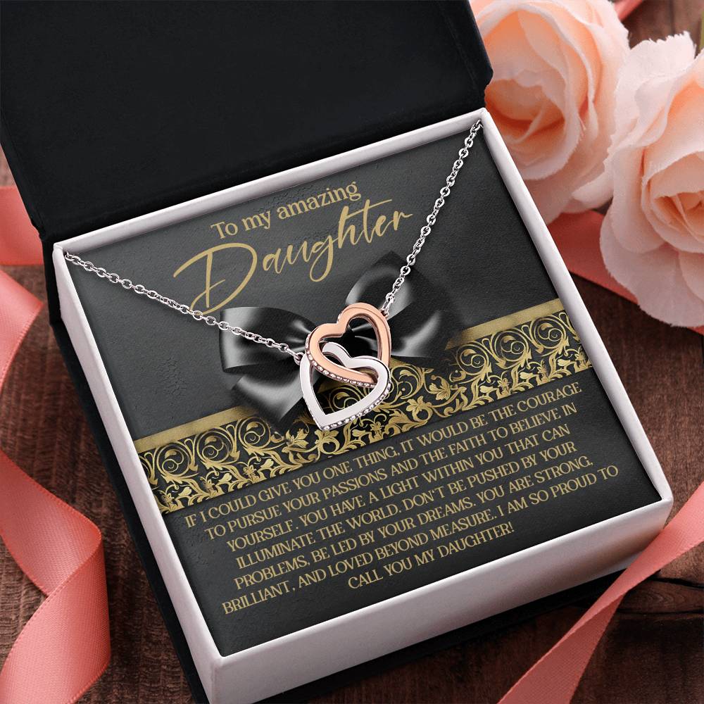 Featuring two lovely hearts embellished with cubic zirconia crystals, this Interlocking Hearts necklace is the perfect accessory for everyday wear. It's a memorable and very special birthday, graduation, wedding, Christmas, or any holiday occasion gift for your lovely daughter.,