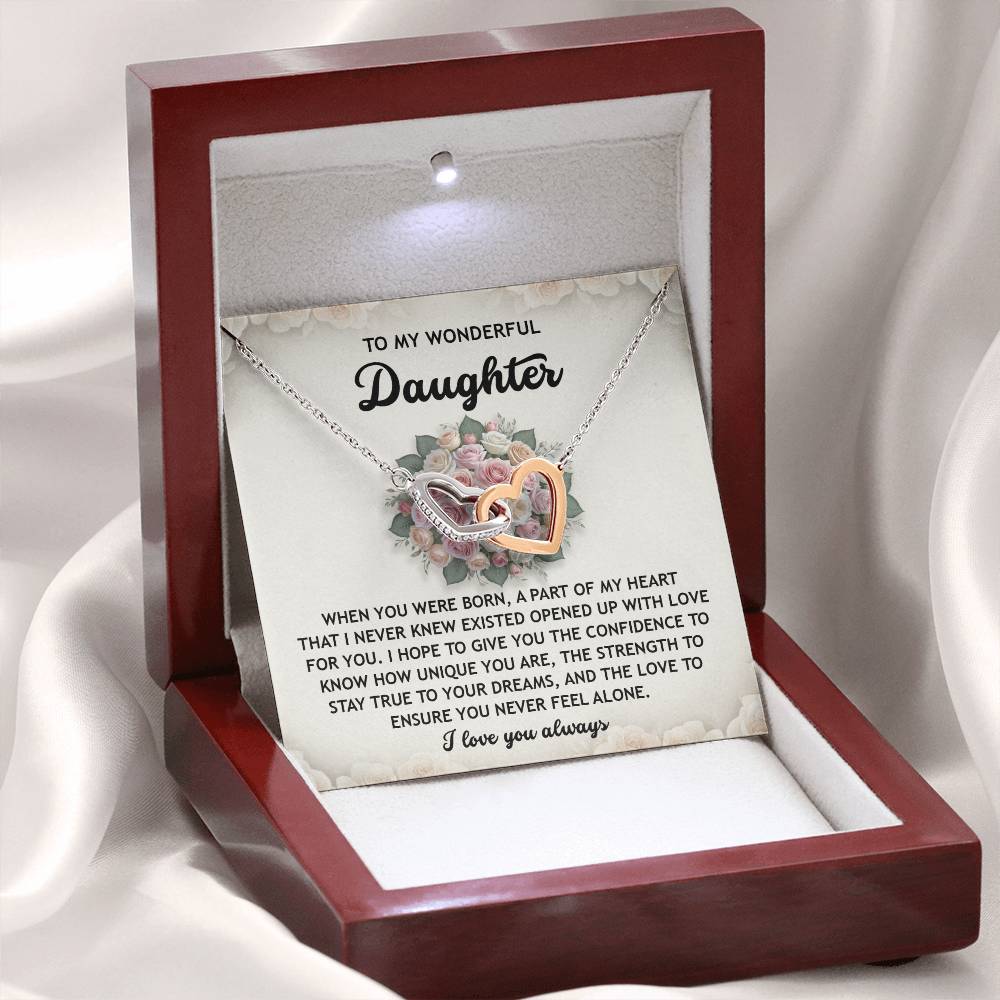 Featuring two lovely hearts embellished with cubic zirconia crystals, this Interlocking Hearts necklace is the perfect accessory for everyday wear. It's a memorable and very special birthday, graduation, wedding, Christmas, or any holiday occasion gift for your lovely daughter.,
