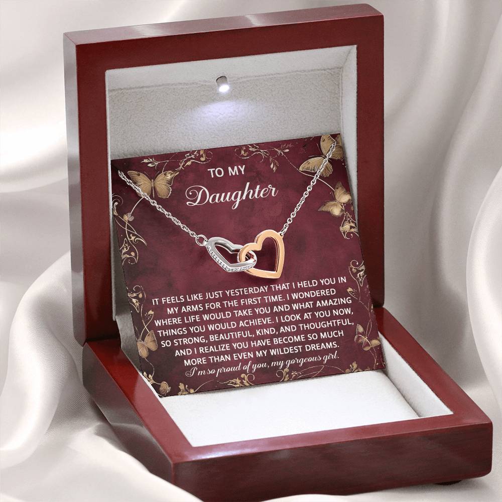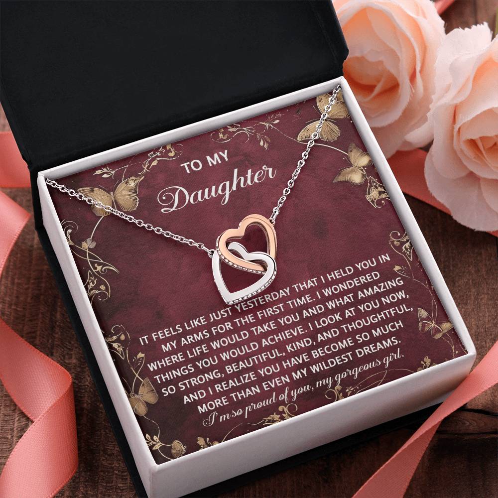 Featuring two lovely hearts embellished with cubic zirconia crystals, this Interlocking Hearts necklace is the perfect accessory for everyday wear. It's a memorable and very special birthday, graduation, wedding, Christmas, or any holiday occasion gift for your lovely daughter.,