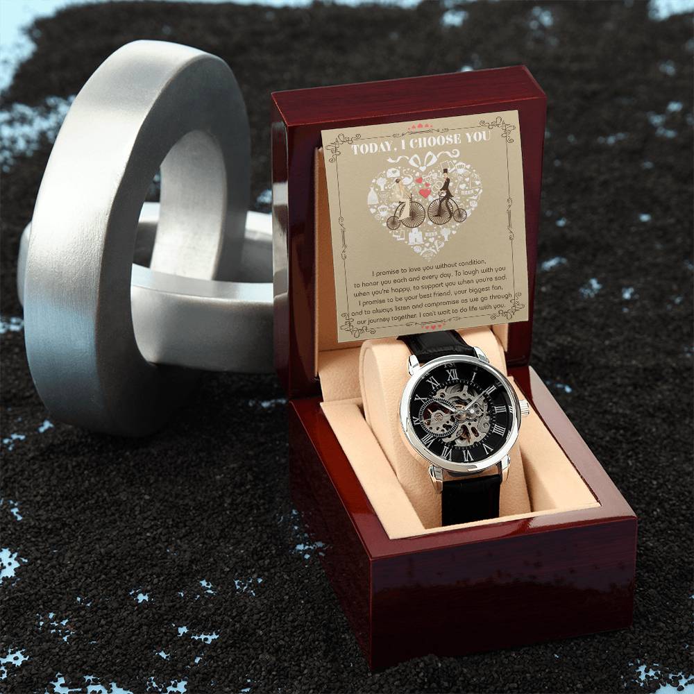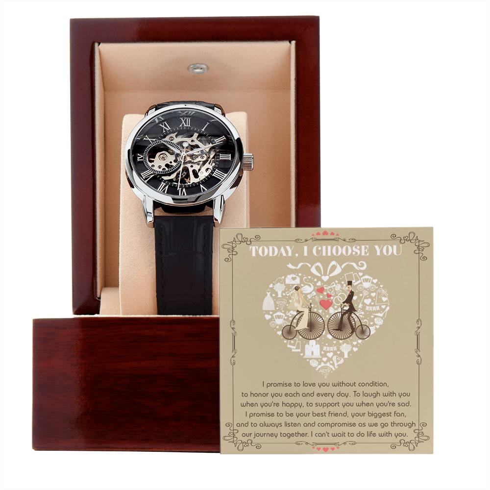 Give the gift of luxury with this handsome and daring timepiece. The Men's Openwork Watch is the perfect blend of classic design and modern styling, making it an essential accessory for your remarkable style. This watch sports a genuine leather strap, is splash resistant, and has increased durability thanks to hardened mineral glass. Our unique skeleton dial feature allows you to peer directly into the inner workings of your watch. Beautifully crafted to be automatic, this watch requires motion instead of batteries. You will keep precise time simply by wearing it, no winding necessary. This magnificent piece makes the perfect gift for yourself or any man in your life looking to add a tasteful element into his wardrobe.