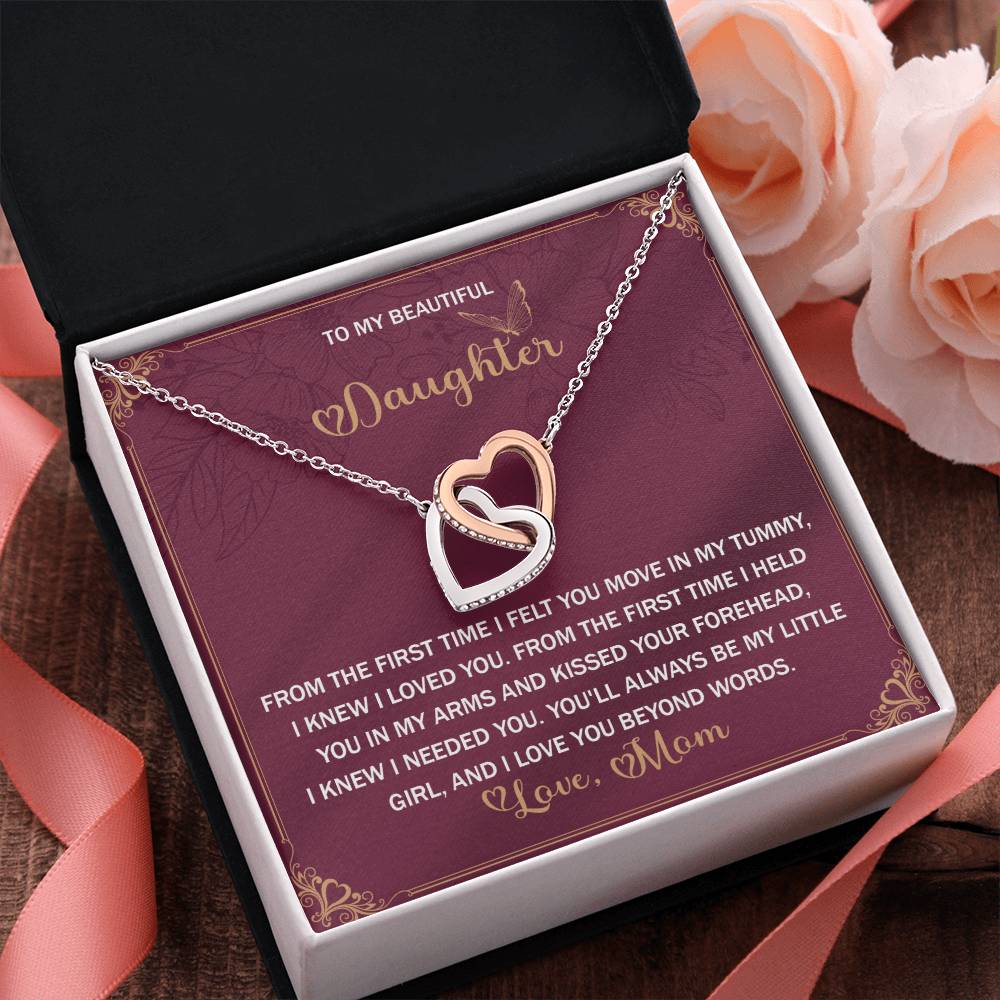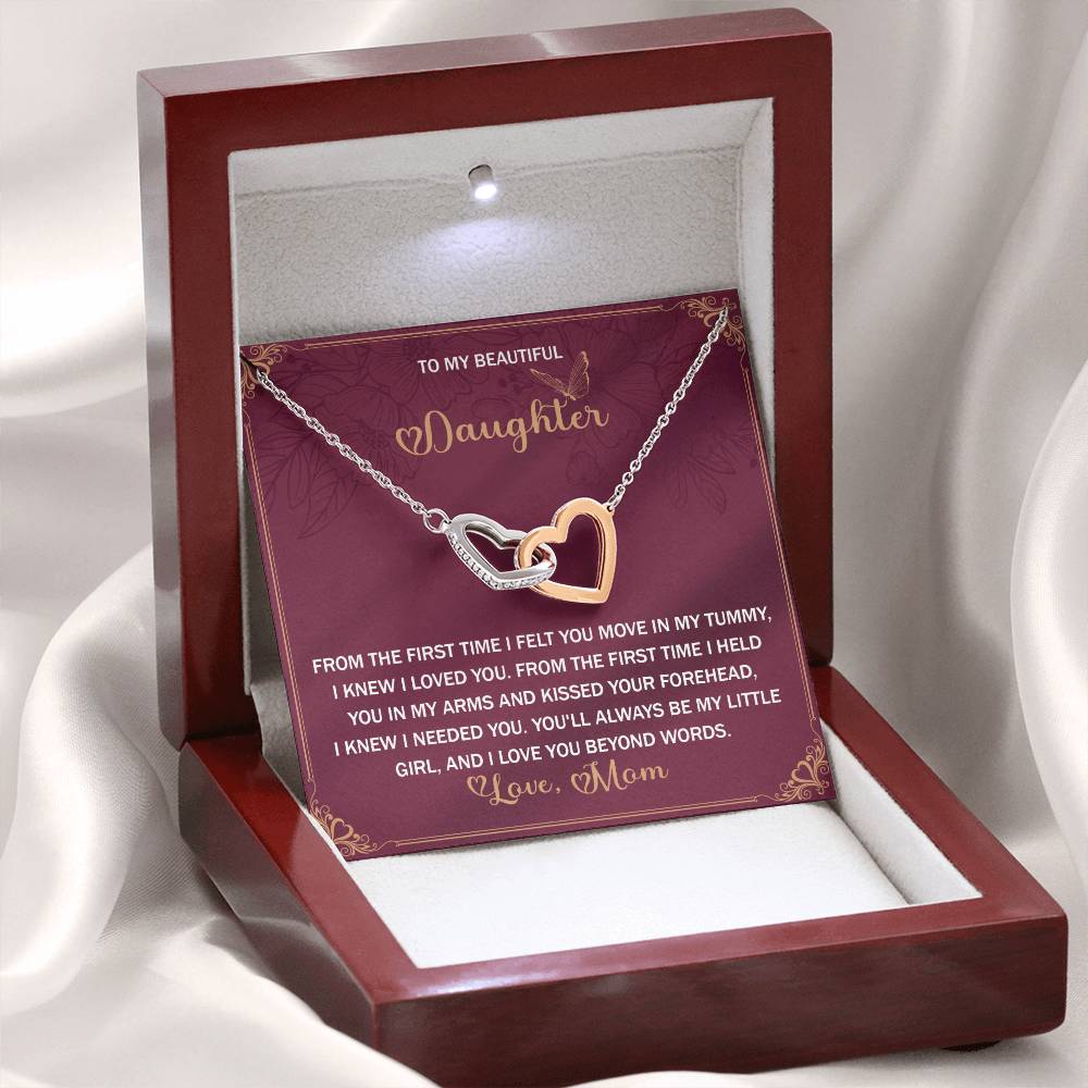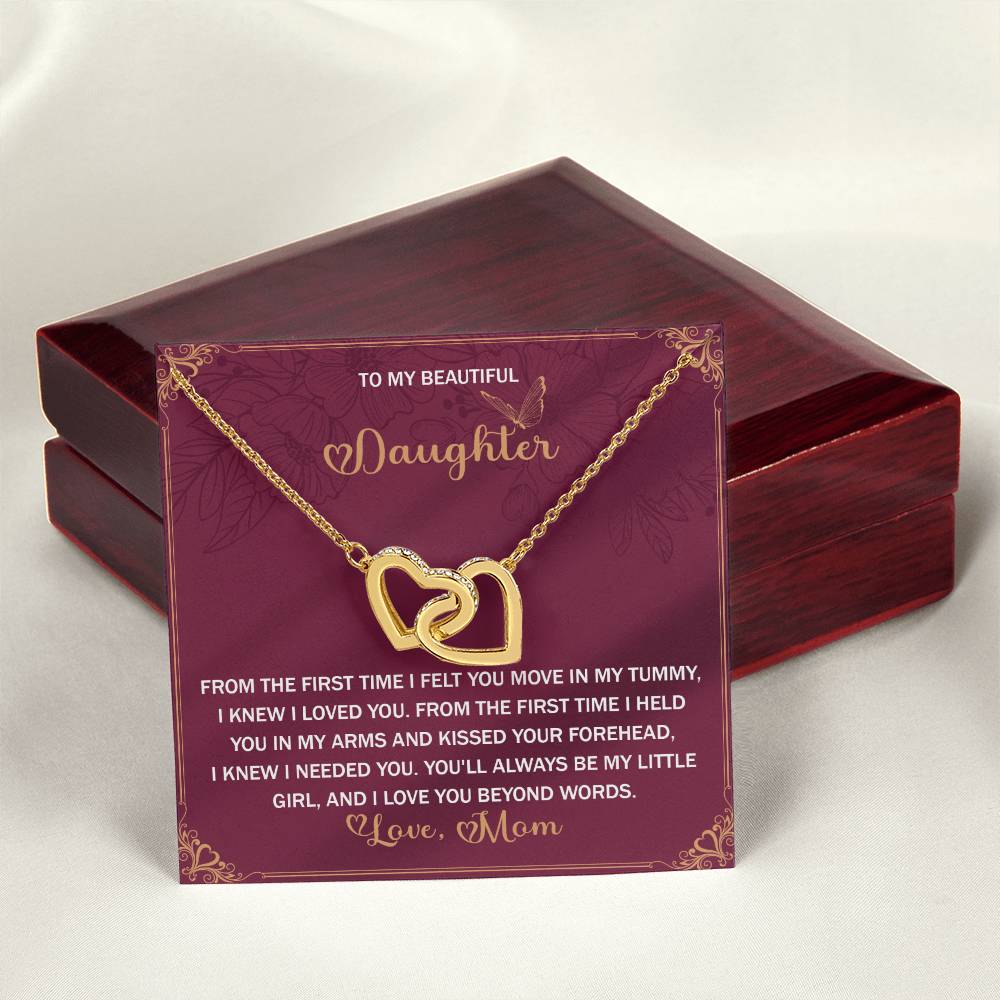 Featuring two lovely hearts embellished with cubic zirconia crystals, this Interlocking Hearts necklace is the perfect accessory for everyday wear. It's a memorable and very special birthday, graduation, wedding, Christmas, or any holiday occasion gift for your lovely daughter.,