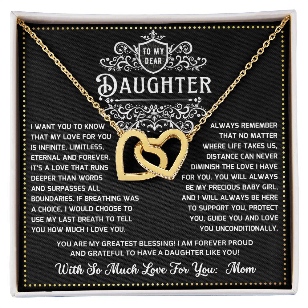 Featuring two lovely hearts embellished with cubic zirconia crystals, this Interlocking Hearts necklace is the perfect accessory for everyday wear. It's a memorable and very special birthday, graduation, wedding, Christmas, or any holiday occasion gift for your lovely daughter.,
