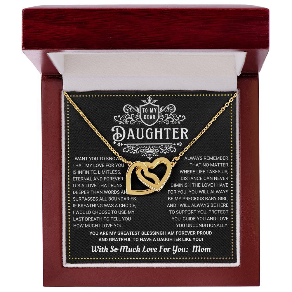 Featuring two lovely hearts embellished with cubic zirconia crystals, this Interlocking Hearts necklace is the perfect accessory for everyday wear. It's a memorable and very special birthday, graduation, wedding, Christmas, or any holiday occasion gift for your lovely daughter.,