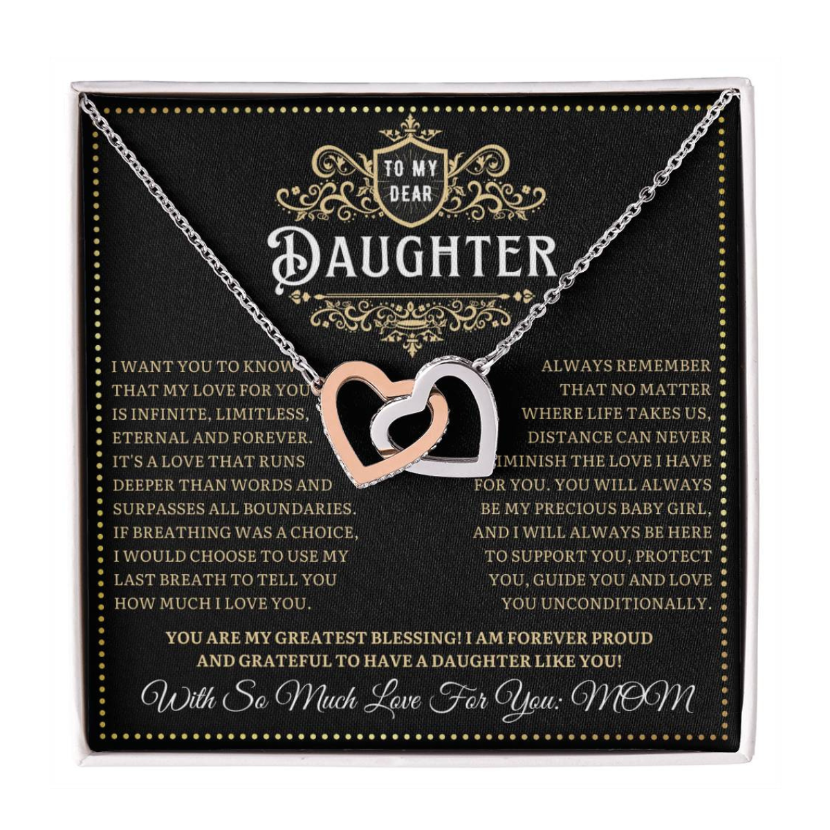 Featuring two lovely hearts embellished with cubic zirconia crystals, this Interlocking Hearts necklace is the perfect accessory for everyday wear. It's a memorable and very special birthday, graduation, wedding, Christmas, or any holiday occasion gift for your lovely daughter.,