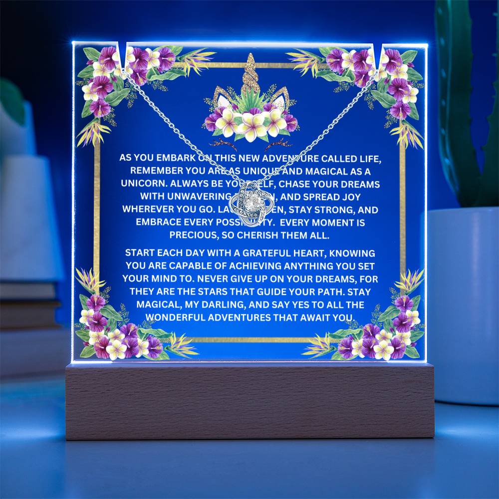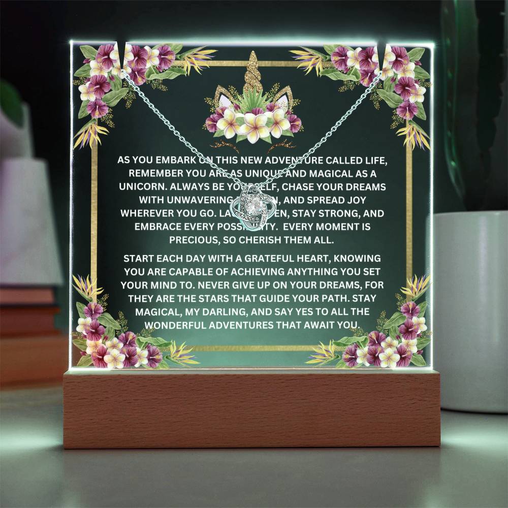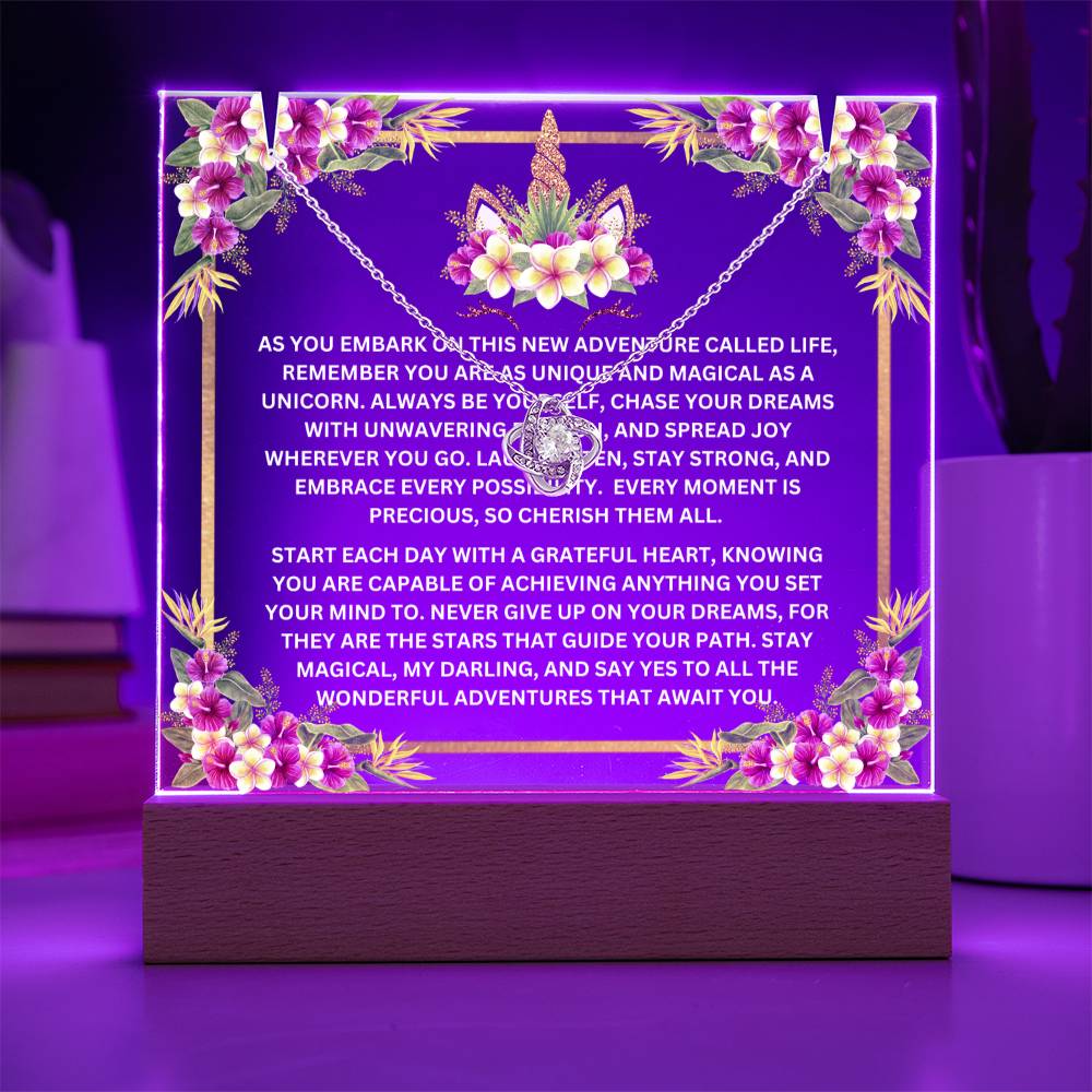THE ACRYLIC PLAQUE: This stunning plaque that illuminates with a mesmerizing array of colors to create a magical atmosphere and features an inspiring message that will remind your child of your unwavering love and support.